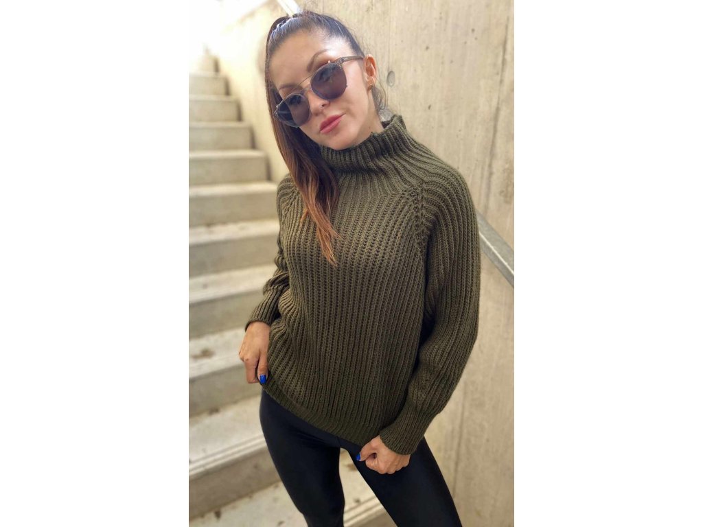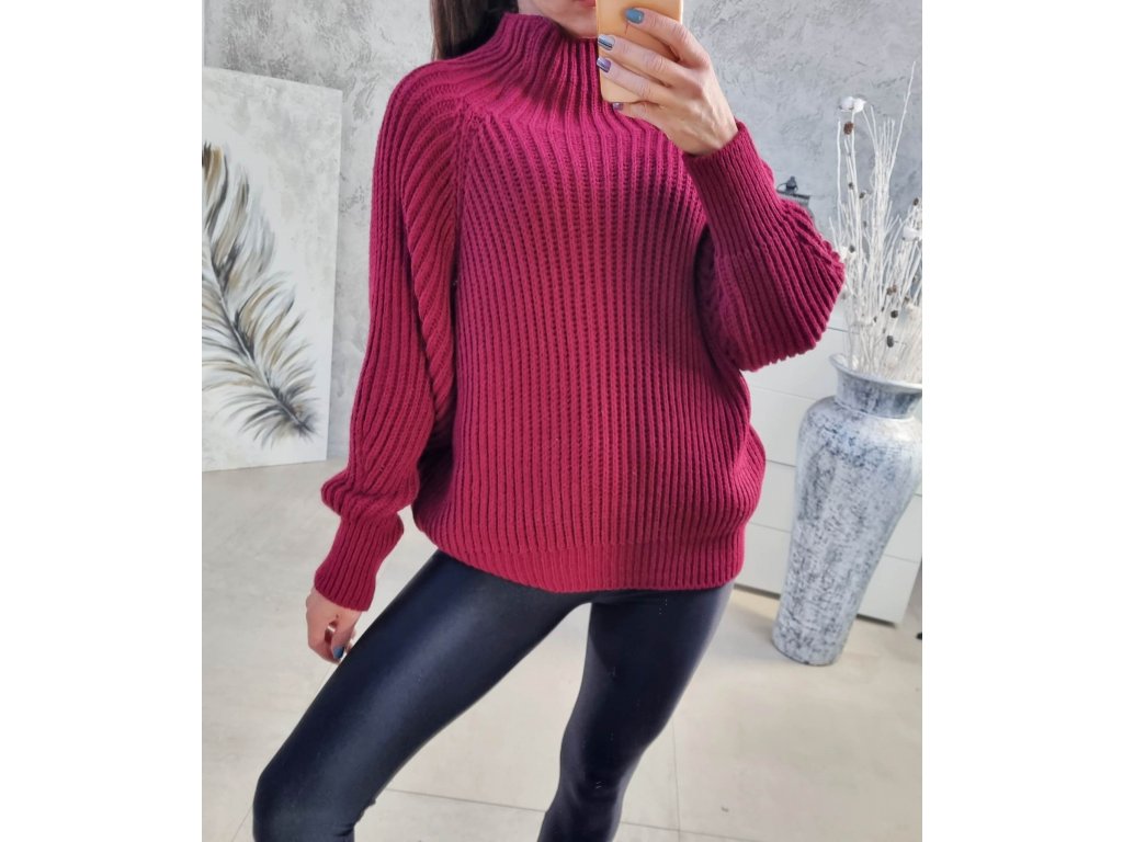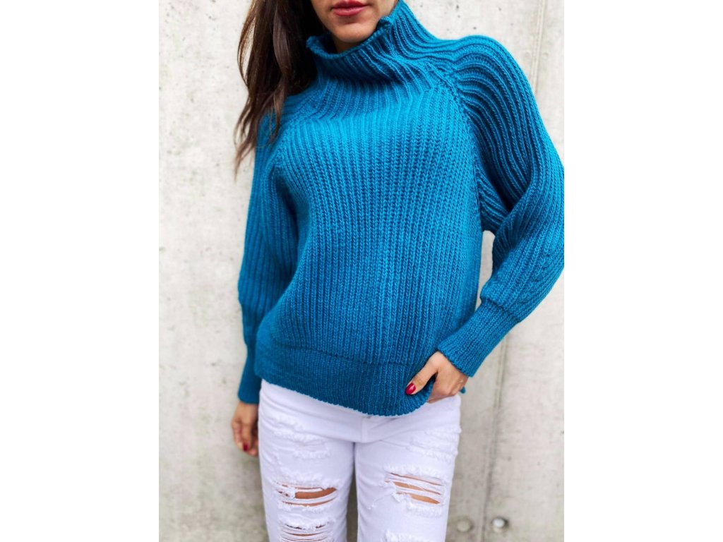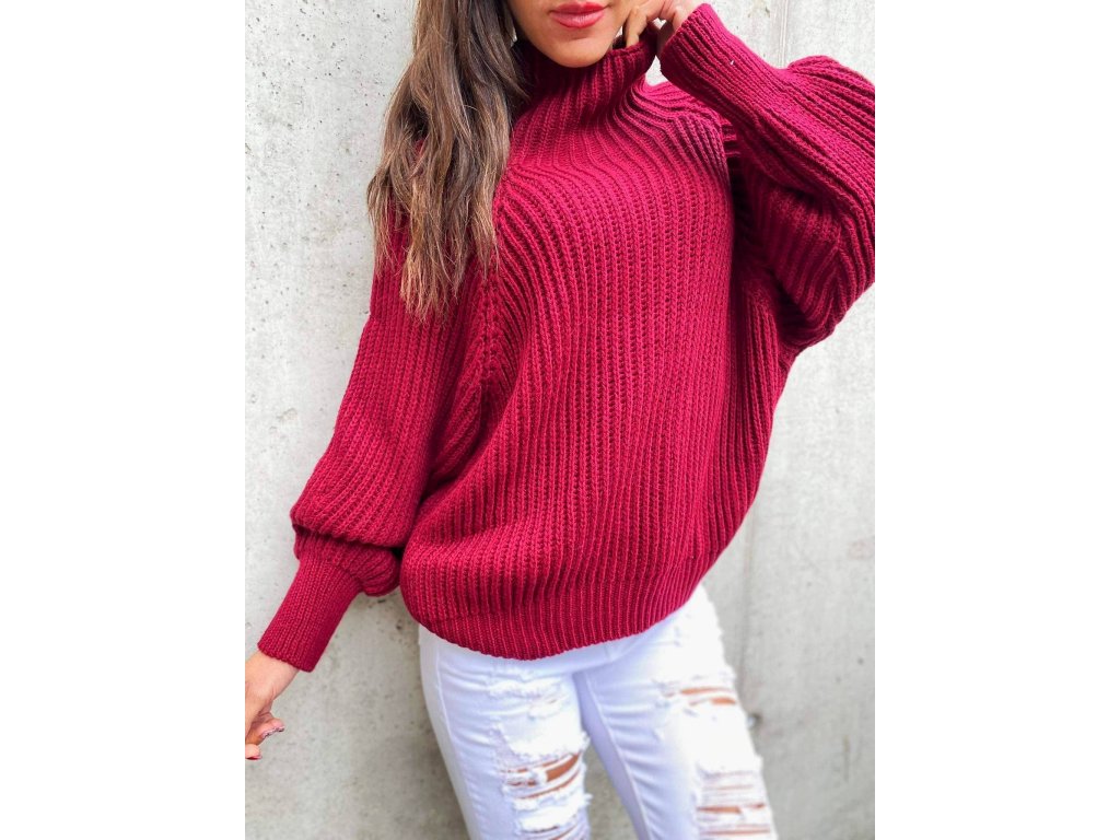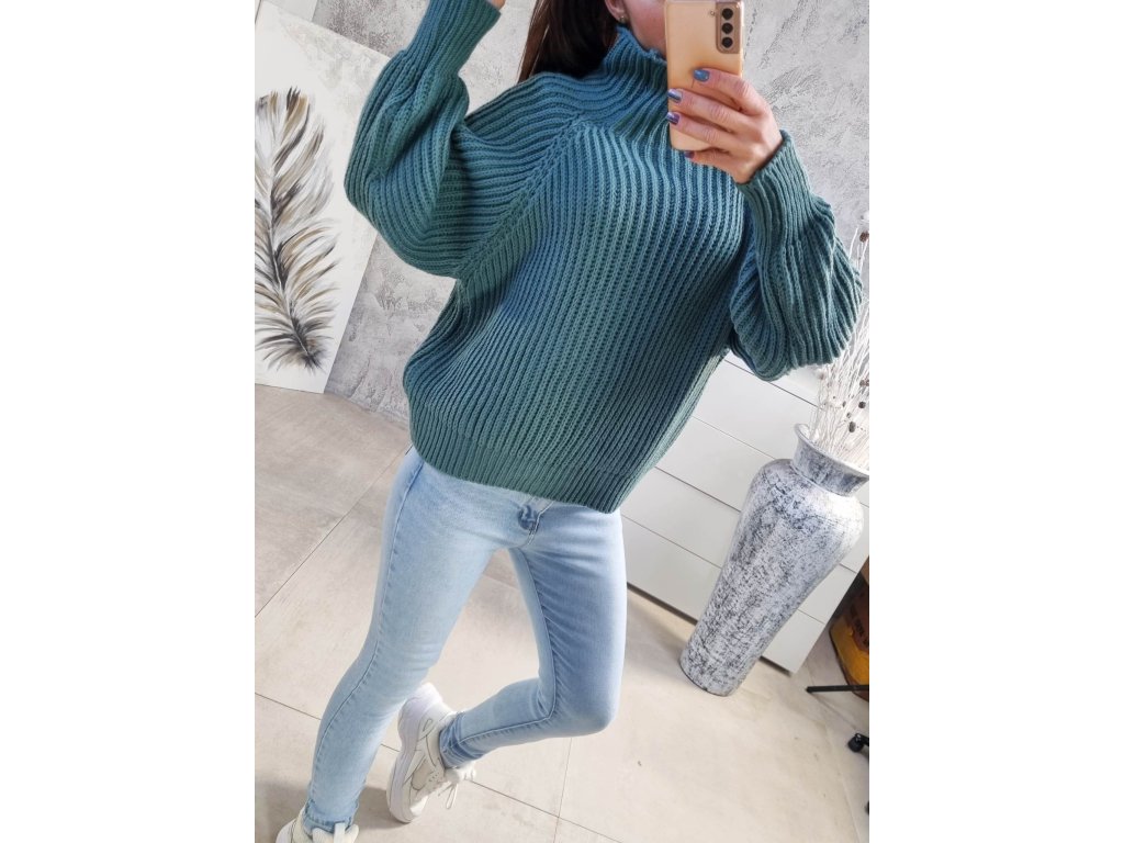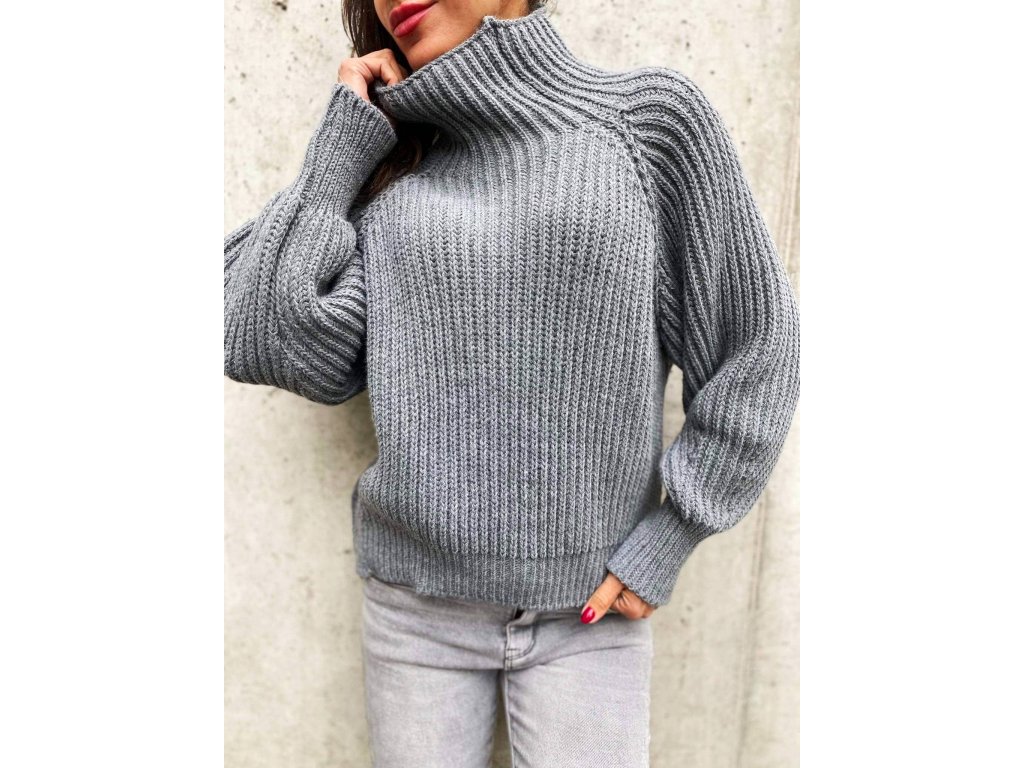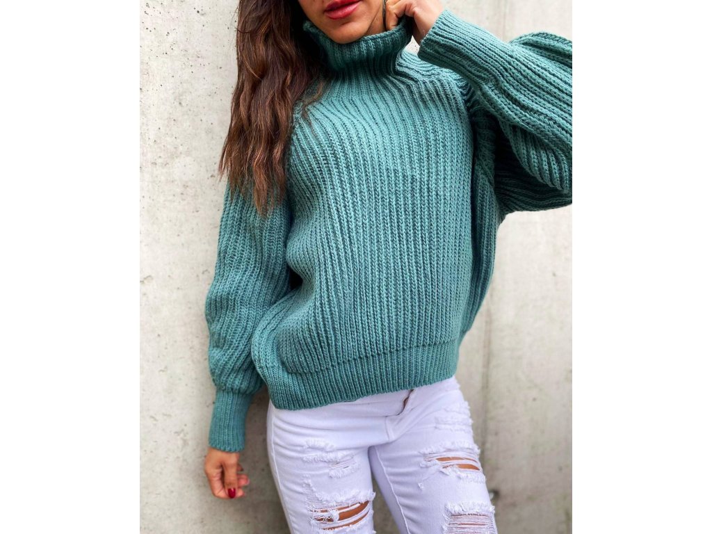 Teplý žebrovaný svetr se stojáčkem a balónovými rukávy. Je silnější a tak dokonale zahřeje.